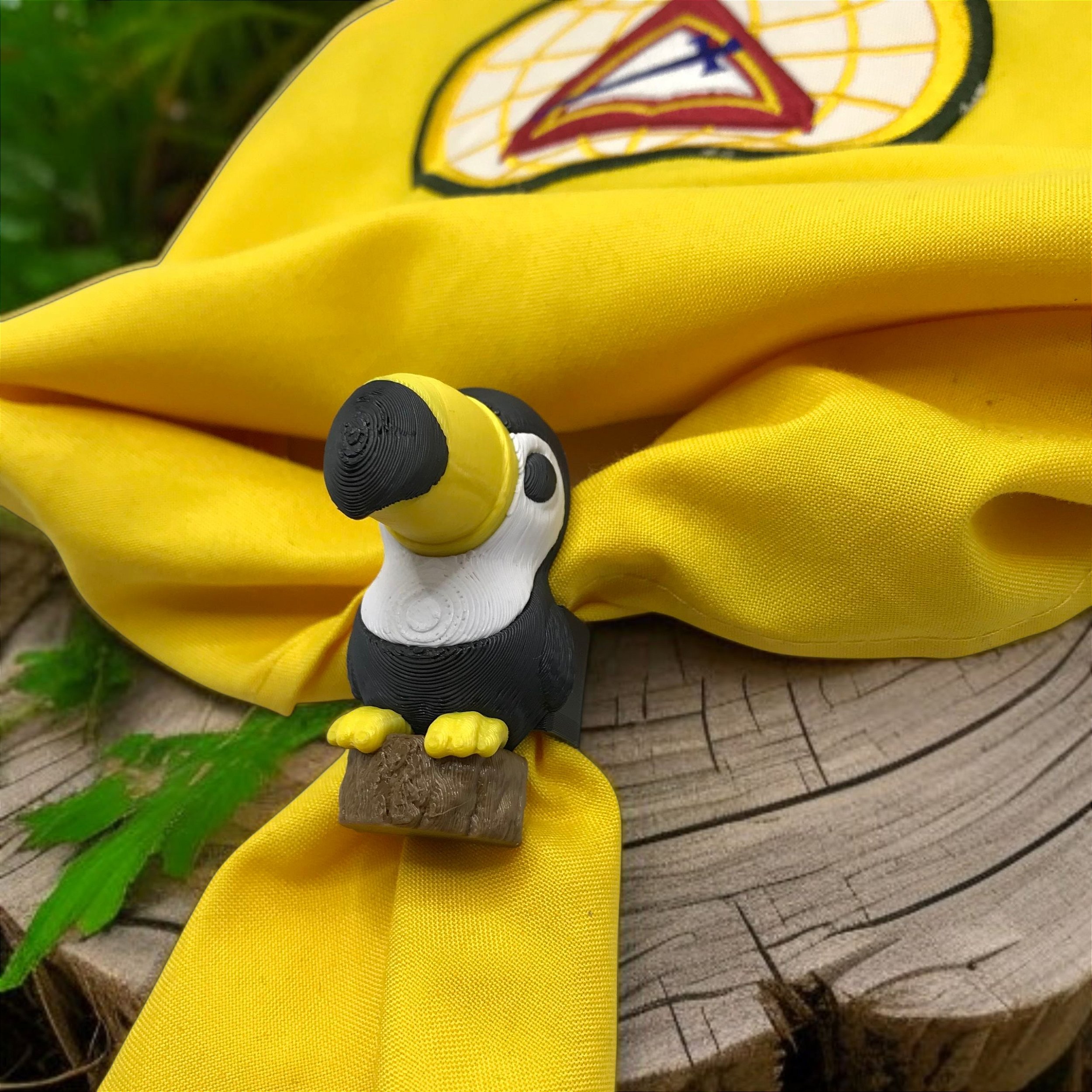 Prendedor de lenço modelo tucano feito em impressão 3D é um acessório encantador e funcional.
